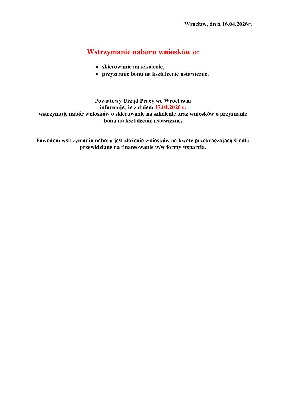 Wstrzymanie naboru wniosków - Powiatowy Urząd Pracy we Wrocławiu